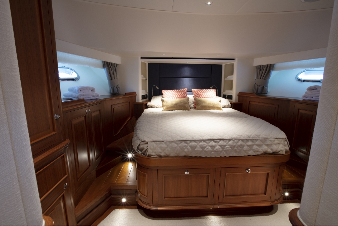 Along with its dynamic, powerful design, the Hunt Ocean 76 offers plenty of cozy features for entertaining guests. Three spacious staterooms and a gourmet galley make this vessel perfect for weekend getaways on the water. Other custom decor details like granite countertops, luxurious bed linens, and top-of-the-line appliances give these yachts an extra extravagent touch.
